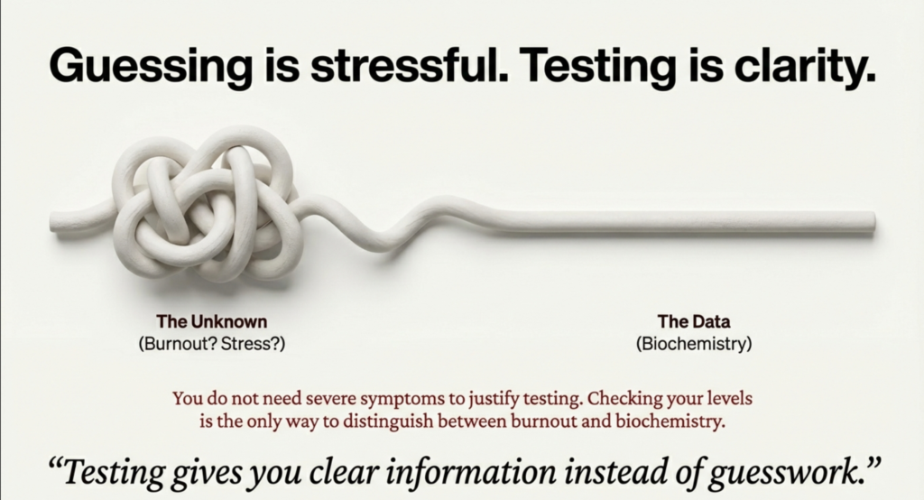 Vitamin D and Ferritin might seem like they wandered in from a different appointment, but they’re connected to testosterone production in ways that matter. Vitamin D deficiency is linked to lower testosterone levels. Low ferritin (your iron storage marker) causes fatigue that looks identical to low T fatigue. Sometimes correcting these deficiencies improves testosterone on its own. No injections. No protocol. Just your body working the way it wants to when you give it what it needs.