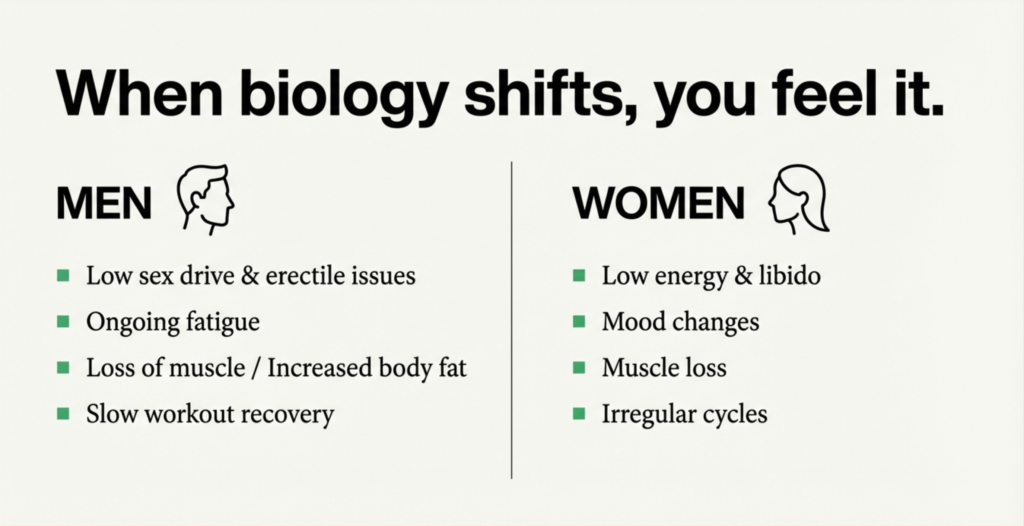 Testosterone affects strength, mood, focus, metabolism, and sex drive. When it drops, you feel it.