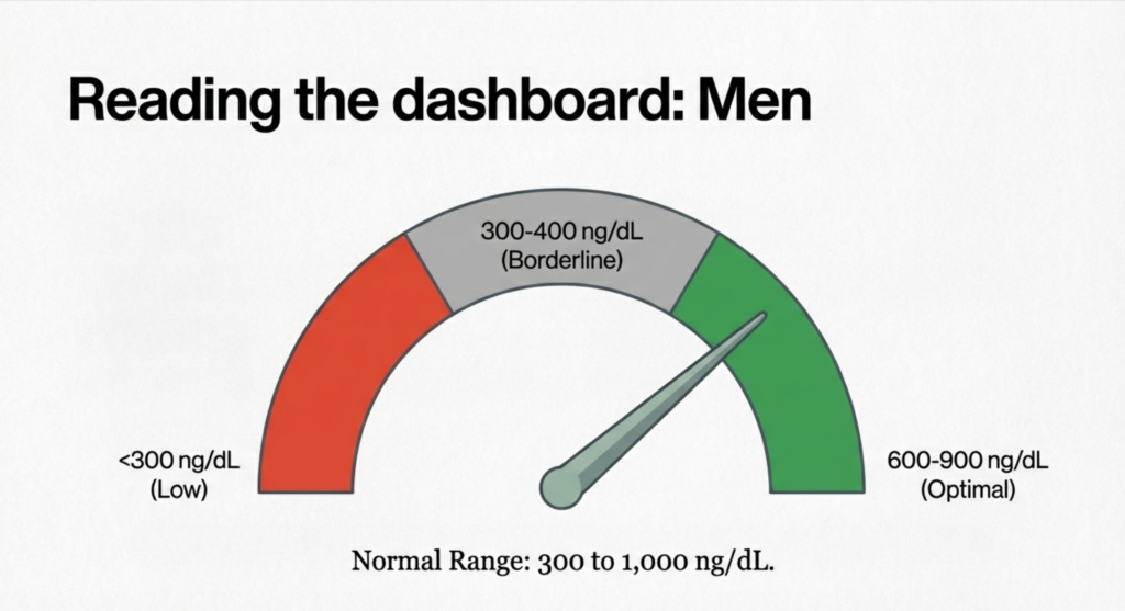 Total Testosterone is the headliner. This measures all the testosterone in your bloodstream, both the stuff bound to proteins and the stuff floating free. Most labs call anything between 300–1,000 ng/dL “normal,” but there’s an enormous, contentious, surprisingly emotional debate about what “normal” even means. A 35-year-old sitting at 310 ng/dL is technically in range. He’s also probably feeling like a phone at 4% battery. Context matters. A good provider looks at your number in relation to your age, your symptoms, your life. Not just whether it clears some arbitrary threshold.